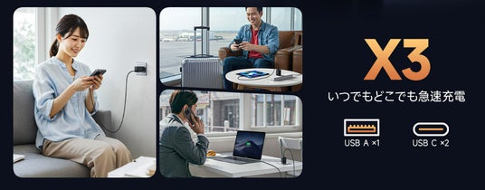 超小型で折りたたみ式プラグを採用し、5.25×3.9×2.8cmのコンパクトサイズはポケットにもすっぽり収まります。重量はわずか81gで、旅行や出張の際も荷物になりません。さらに、2つのType-Cポートと1つのUSB-Aポートを備え、最大3台のデバイスを同時に充電可能。これ1台で複数機器の充電ニーズに応え、デスク周りもすっきり整理できます。