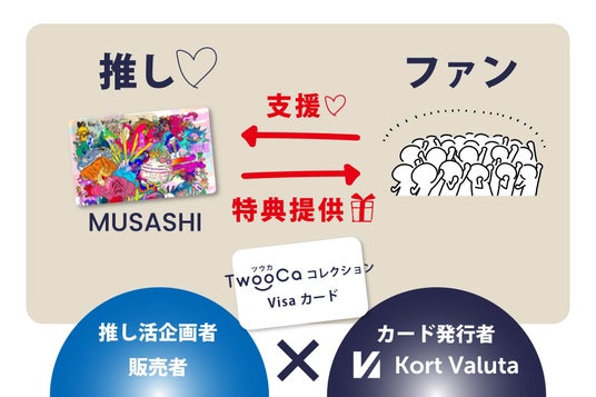 今後、MUSASHI氏と当社は、当社の新サービスとして企画しているオリジナルデザインの無記名Visaプリペイドカード「TwooCaコレクションVisaカード」でタイアップする予定です。TwooCaコレクションVisaカードは、プリペイドカードを軸とした「新しい推し活」を実現します。そして当社はMUSASHI氏のアートがデザインされたTwooCaコレクションVisaカードを制作する予定です。