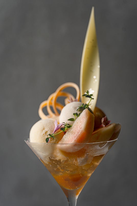 グラスのトップに大きめにカットした桃を贅沢に。桃アイスとグレープフルーツ&ライチのソルベがみずみずしい爽やかさを添え、バニラアイスとふんわり軽い桃のエスプーマがまろやかに包み込みます。さらに、ココナッツパウンドケーキやライム寒天、ミントゼリー、そして桃のコンフィチュールが層を成し、ひと口ごとに果実感と清涼感が広がる一品です。