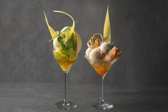 マスカットとメロンの果実が華やかにトップを彩ります。マスカットソルベとメロンアイスが爽やかに重なり、バニラアイスがまろやかなコクをプラス。ベルガモットのエスプーマが軽やかな香りを添え、ココナッツパウンドケーキがほんのりとした甘さと深みを加えます。グラスの底には、ジャスミンティージュレと洋ナシのピューレが控え、最後のひと口まで涼やかで上品な余韻が続きます。
