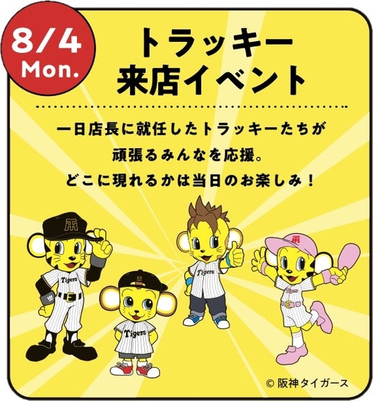 阪神タイガースの人気キャラクター、トラッキー・ラッキー・キー太・コラッキーが8月4日(月)限定で1日店長・副店長に就任し、頑張るみんなを応援します。どこに現れるかは当日のお楽しみ!