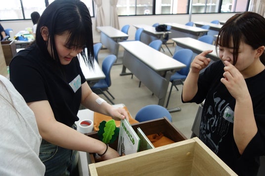 初めての絵本棚の作成に戸惑いながらもみんなで楽しく作業が進みました。絵本棚が完成する頃には、初めて出会った高校生と短大生はすっかり仲良しに。