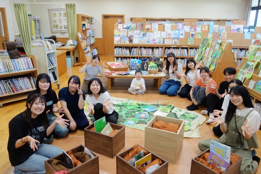 絵本棚を作成してくれたのは、島根県内の高校生6名と島根県立大学短期大学部の学生5名です。絵本棚は、親子が畑で野菜を収穫するイメージで、種類の違う4つの棚を作成しました。きゅうり畑,土の畑,スイカ畑,野菜収穫後の棚です。