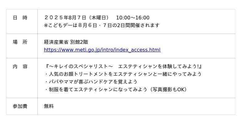 一般社団法人日本エステティック振興協議会(所在地:東京都台東区、理事長:瀧川睦子)では、2025年8月7日(木)に経済産業省が開催する、夏休み期間中のお子様が各業界の仕事を楽しく学べる「経済産業省こどもデー」に、エステティックやエステティシャンのお仕事について、実際の体験を通して魅力をお伝えするべく出展いたします。