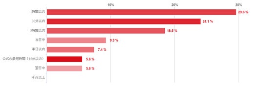 SMBCモビットの審査結果が通知されるまでの時間は、「1時間以内」が最も多く29.6%、続いて「30分以内」が24.1%、「3時間以内」が18.5%となった。