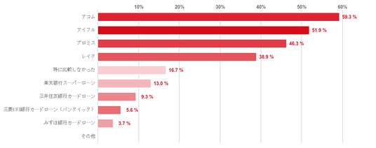 SMBCモビットと同じ大手の消費者金融を比較対象としている人が多かった。SMBCモビットの金利はもちろん、審査や手続きの利便性・スピードなどを比べていると考えられる。