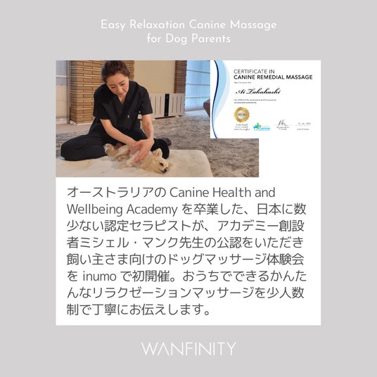 アカデミーの創設者であるミシェル・マンク先生の公認をいただい、飼い主様向けのドッグマッサージ体験会をinumoで初開催します。おうちでできるかんたんなリラグゼーションマッサージを、少人数制で丁寧にお伝えします。