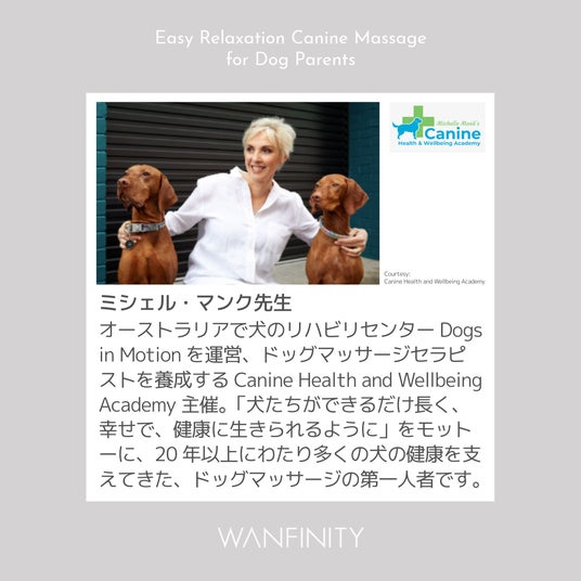 ミシェル・マンク先生オーストラリアで犬のリハビリセンター Dogs in Motionを設立・運営、プロのドッグマッサージのセラピストを養成する Canine Health and Wellbeing Academyを主催。「犬たちができるだけ長く、幸せで、健康に生きられるように」をモットーに、20年以上にわたり多くの犬たちの健康を支えてきた、ドッグマッサージの第一人者です。
