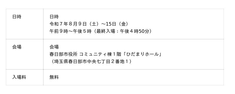 8月9日(土)から15日(金)、春日部市役所「ひだまりホール」にて。入場は無料。来場者アンケート回答者対象の抽選会も実施。