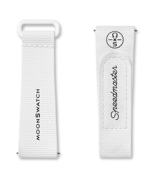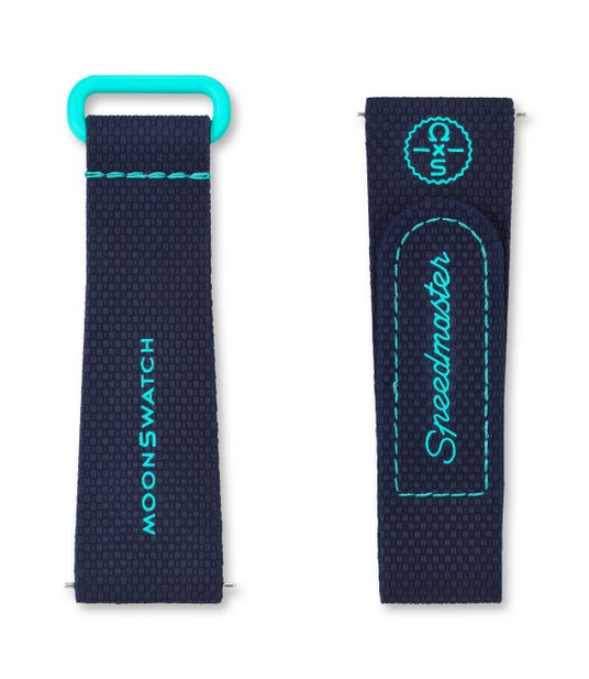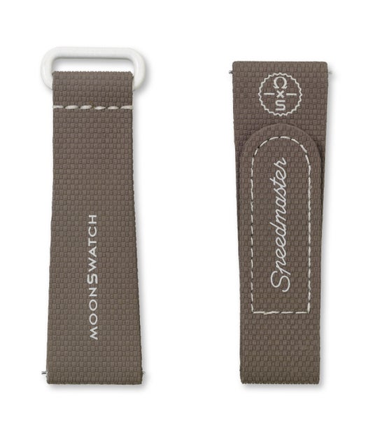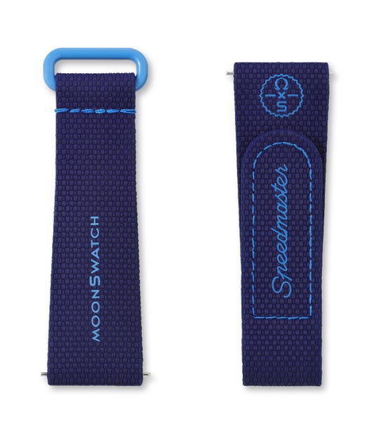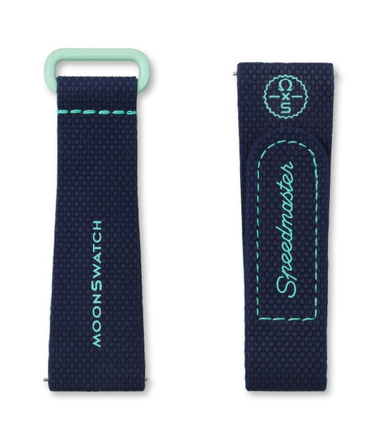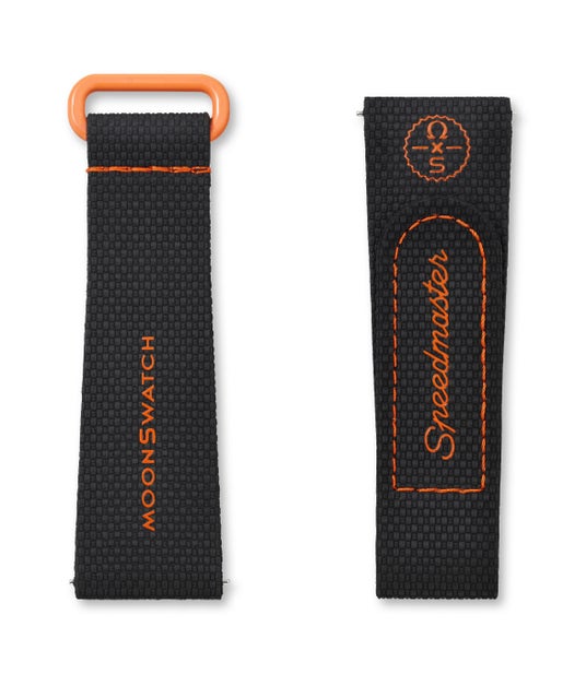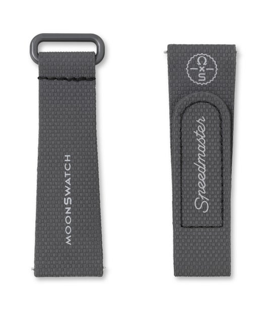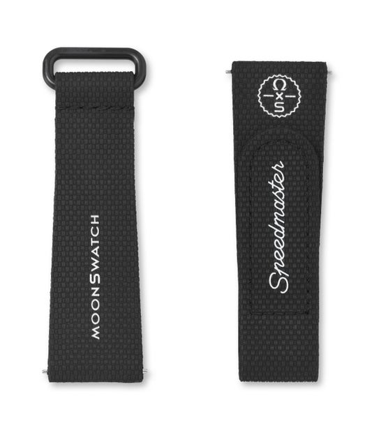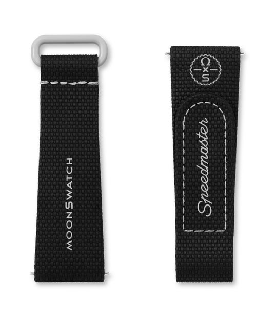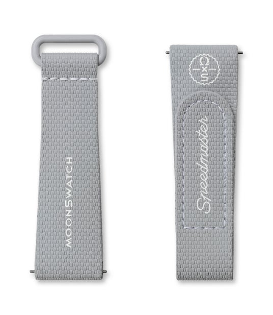 高品質のラバー製で、両面にテクスチャーパターンが施され、BioceramicループとVELCRO(R)クロージャーを採用しているのが特徴。ストラップは表側が宇宙服、裏側が月面のクレーターをイメージしています。Bioceramic MoonSwatch コレクションの時計と同様に、ストラップにもOMEGA X Swatch、MoonSwatch、そしてアイコニックなSpeedmasterのロゴがあしらわれています。