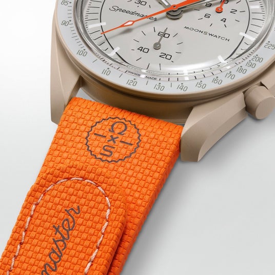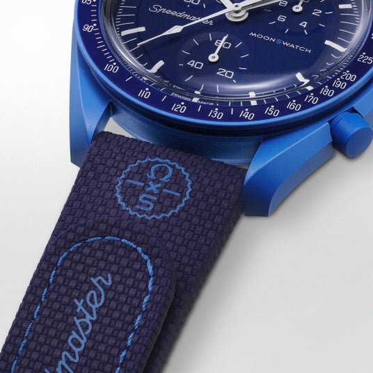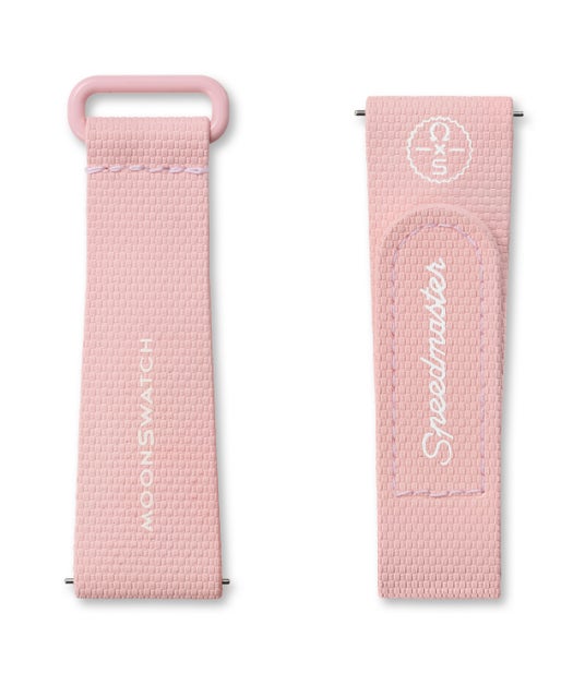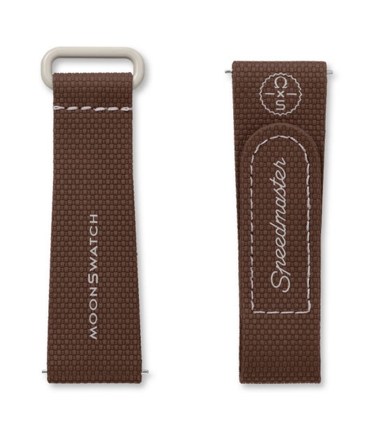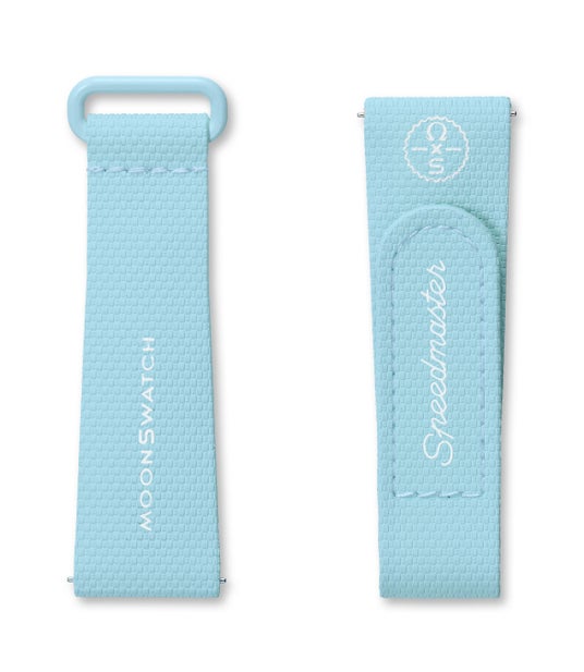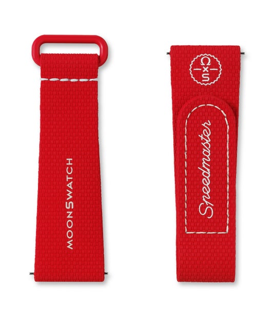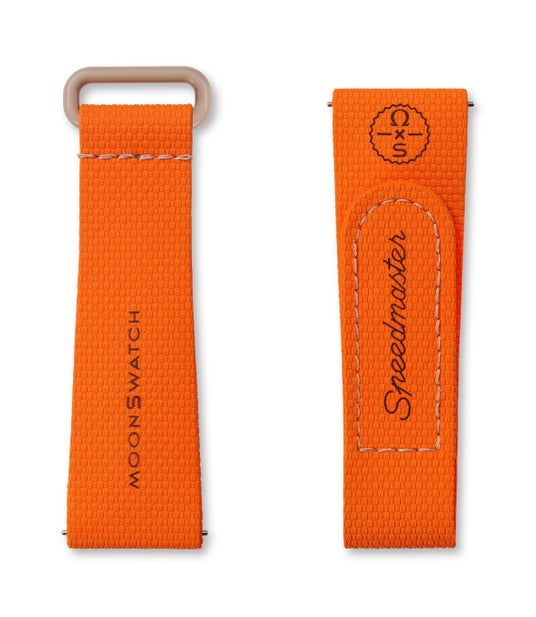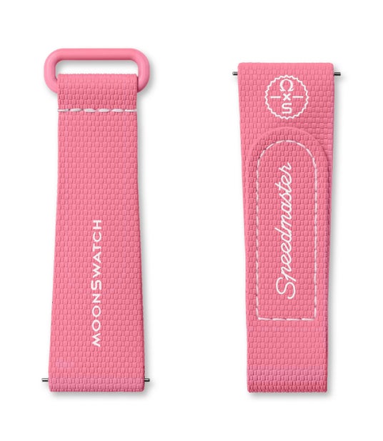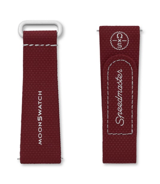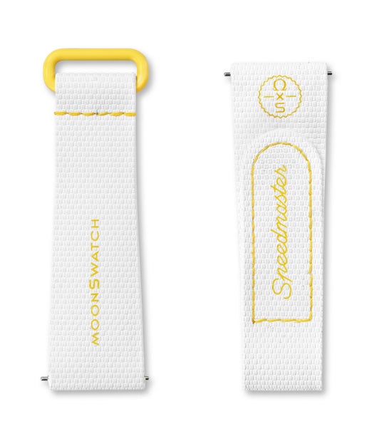 高品質のラバー製で、両面にテクスチャーパターンが施され、BioceramicループとVELCRO(R)クロージャーを採用しているのが特徴。ストラップは表側が宇宙服、裏側が月面のクレーターをイメージしています。Bioceramic MoonSwatch コレクションの時計と同様に、ストラップにもOMEGA X Swatch、MoonSwatch、そしてアイコニックなSpeedmasterのロゴがあしらわれています。