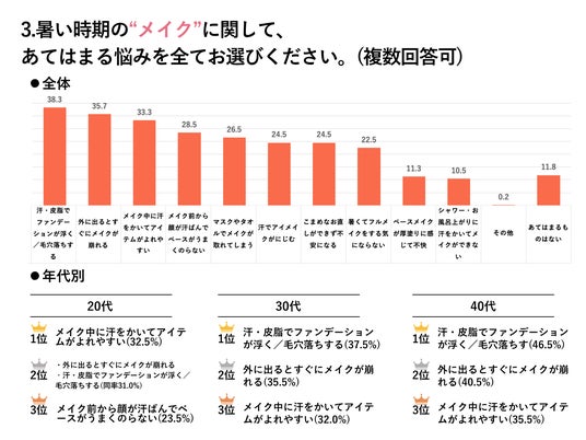 暑い時期のメイクの悩みで全体として最も多かったのは「汗・皮脂でファンデーションが浮く/毛穴落ちする(38.3%)」で、年代が上がるにつれスコアも上昇していました。