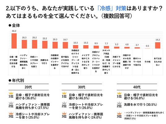 2.実践している冷感対策:「日傘・帽子」が定番。20代は「ハンディファン」、40代は「水洗顔」など年代ごとで対策が異なる