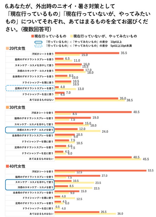 6. 外出時のニオイ・暑さ対策:「汗拭きシート」利用が最多。冷感コスメ、30代・40代女性では実践率1割前後・関心は2割超でこれから実践?