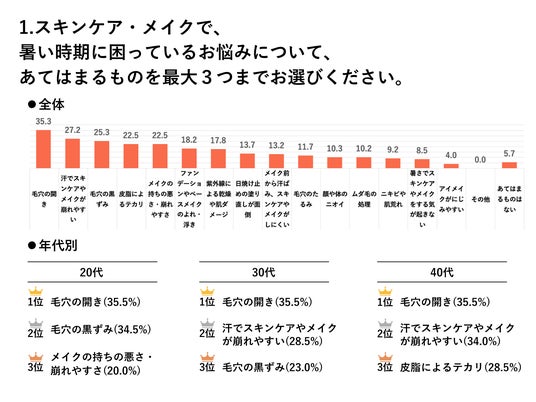 暑い時期に困るスキンケア・メイク悩みは「毛穴の開き(35.3%)」が全体でトップ。