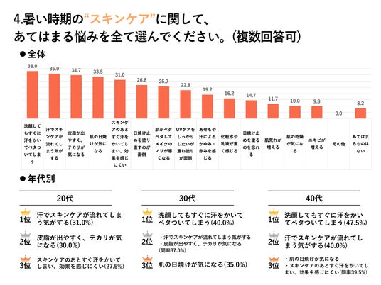 4.暑い日のスキンケアの悩み: 洗顔後の汗やベタつき、日焼けは20代から40代にかけて悩む割合が上昇傾向