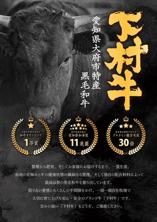 当社のグループ会社である下村畜産が、一頭一頭の個性に向き合い独自配合飼料やマッサージなど、たっぷり愛情を注いで育てた「下村牛」はうまみ成分であるグルタミン酸を通常の30倍も含んでおります。そして、オレイン酸の含有量も非常に多く、脂の融点が低く人肌で溶けるほどの脂でまろやかな口当たりは良いのが特徴で、数々の栄誉ある賞を頂いております。また、昨今では海外からのお問い合わせも多くいただいております。