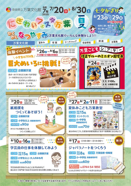 万葉文化館では7/20(日)~8/30(土)の間、「にぎわいフェスタ万葉 夏」を開催します。土日祝日を中心に、イベント盛りだくさんで皆様のご来館をお待ちしております。各イベントの詳細は別紙チラシをご覧ください。