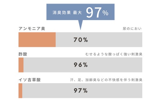 汗や加齢臭、部屋干し臭やアンモニア臭などの嫌なニオイを最大97%抑制します。