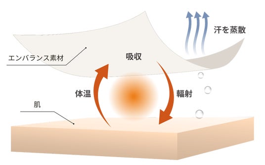 体温 = 遠赤外線の吸収・輻射(ふくしゃ)を繰り返して体温を保温。自然な温かさをキープしながら身体のめぐりをサポートします。また、水分蒸散が促されることでムレにくく、いつでもさらりとした肌ごこち。