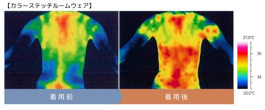 ※検査機関調べ<試験方法> 測定環境にて椅座位で被験者が十分に安静にした後、カラーステッチルームウェアを30分間着用し安静にした。着用前と着用後の皮膚表面温度をサーモグラフィにて撮影。<被験者情報> 成人女性(48歳/身長166cm/体重51kg)