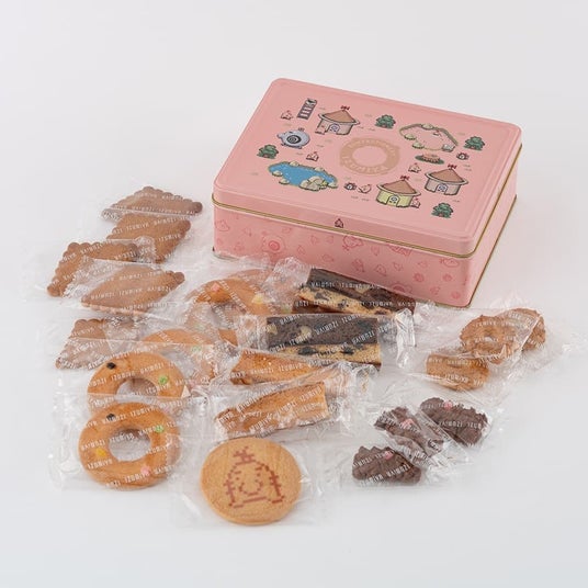 泉屋と「ほぼ日『MOTHER』プロジェクト」とのコラボレーションで、どせいさんのオリジナルクッキーが入った、サターンバレーのクッキーボックスができました。エンボス加工をほどこした缶のフタは独特の立体感があり、どせいさんたちは、ぷっくりとして、さらにかわいい存在に。温泉や池は一段低くなり、おうちや岩は少し盛り上がっており、なめらかな凹凸の手触りを感じていただけます。