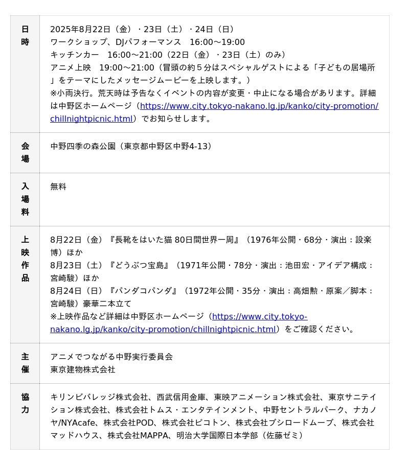 東京建物株式会社は、中野四季の森公園において、2025年8月22日(金)からの3日間、オフィスビル「中野セントラルパークイースト」の壁面にアニメーション映画の投影等を行う産官学連携イベント「中野チルナイトピクニック」(以下「本イベント」)を開催しますので、お知らせします。