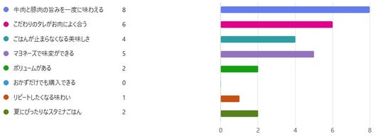 「黒の牛豚ダブル焼肉」で最も多くの票を集めたのは『牛肉と豚肉の旨みを一度に味わえる』というポイントでした。以下2位は『こだわりのタレがお肉によく合う』、『マヨネーズで味変ができる』でした。