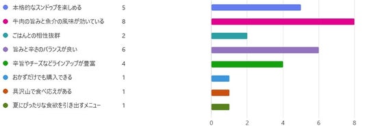 「赤の牛スンドゥブ」で最も多くの票を集めたのは『牛肉の旨みと魚介の風味が効いている』というポイントでした。以下2位は『旨みと辛さのバランスが良い』、『本格的なスンドゥブを楽しめる』でした。