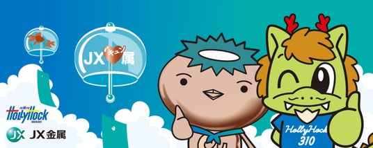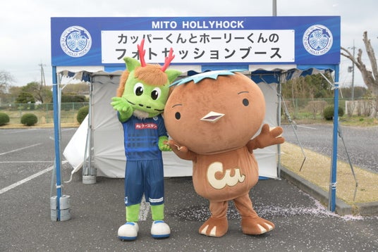 日立市民運動公園 陸上競技場に、水戸ホーリーホックマスコットキャラクターの「ホーリーくん」とJX金属PR大使の「カッパーくん」が来場!