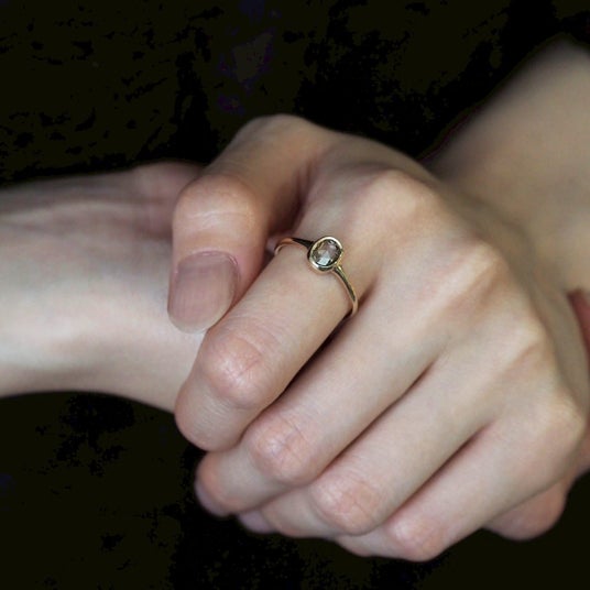 お仕立てに用いるのは、整えすぎず、削りすぎないラフカットの天然石。ありのままの輪郭を残した"地球のかけら"を、繊細な3本爪でそっと留め、周囲にはメレストーンが静かに添えられます。石と取り巻きのあいだに生まれるわずかな"隙間"が、風が通り抜けるような軽やかさと、余韻をジュエリーにもたらしてくれます。