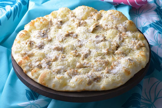 ツナとマヒマヒのポリネシア風ピザポリネシア諸島では、ツナとマヒマヒ(シイラ)を使った魚料理が定番。ココナッツといっしょに焼き上げて、南国気分を盛り上げます。
