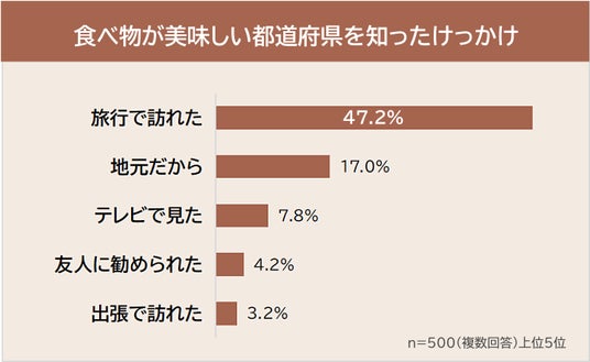 「食べ物が美味しい都道府県を知ったきっかけ」の1位は「旅行で訪れた(47.2%)」でした。2位「地元だから(17.0%)」も多くなっています。