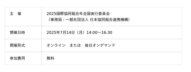2025国際協同組合年全国実行委員会は、活動目標「協同組合に対する理解を促進し、認知度を高めること」「協同組合の事業・活動・組織の充実を通じてSDGs達成に貢献すること」にもとづき本年、以下のテーマで連続シンポジウムを開催しています。