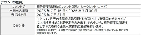 暗号資産市場の急速な発展に伴い、関連企業の成長も著しいものがあります。2025年7月31日に設定する「暗号資産関連株式ファンド(愛称:シークレット・コード)」は、こうした投資機会を捉えることで、投資家の皆さまに新たな資産運用の選択肢を提供いたします。