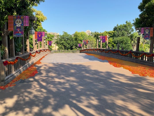 期間中、映画の物語の核でもあるメキシコの伝統文化「ディア・デ・ロス・ムエルトス」(スペイン語で「死者の日」の意)をモチーフに色鮮やかで温かみあふれる世界が広がります。ロストリバーデルタに架かる橋"プエンテ・ブエナ・ヴィスタ"周辺には、カラフルなガイコツや、魂を導く花とされるマリーゴールドの花々が美しく飾られ、『リメンバー・ミー』の世界の雰囲気を楽しめます。