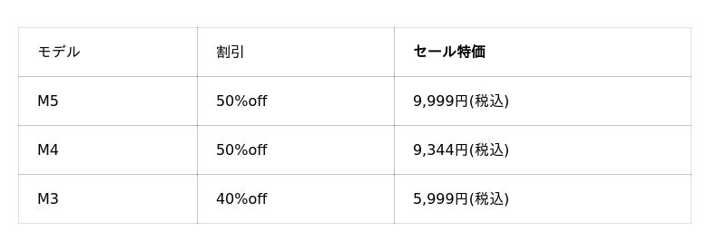 今回のセールでは、下記の通り特別割引価格にてご提供します: