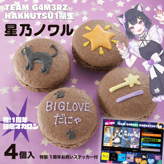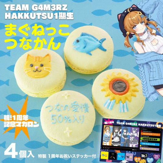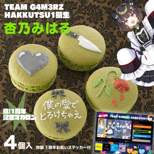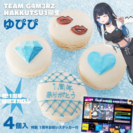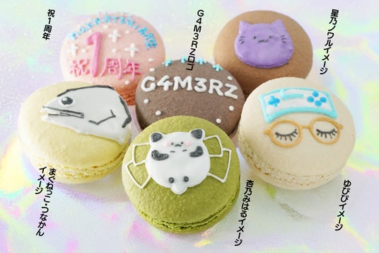 今回は、「TEAM G4M3RZ HAKKUTSU1期生」である、まぐねっこ・つなかん、杏乃みはる、ゆぴぴ、星乃ノワルの4人をイメージしたオリジナルマカロンを、ご本人たち監修のもと製作いたしました。4人それぞれの個性と、同じ所属メンバーとしての絆を、完全オリジナルの繊細なアイシングで表現しています。全メンバーをセットにした特別なデザインと、メンバーそれぞれをイメージした4つのデザインをご用意しました。見てかわいく食べて美味しい、こだわりの詰まった「推しマカロン」をぜひお楽しみください!