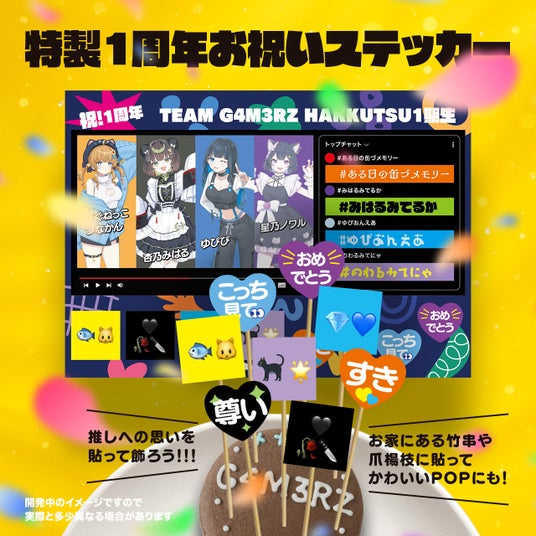 配信サービスの画面とチャットをイメージしたデザインの「特製1周年お祝いステッカー」です。4人のメンバー、ハッシュタグ、推しマークなど、色とりどりのシールをちりばめています。ご自宅の竹串やつまようじに貼ると、かわいいスイーツピックに早変わり! マカロンに刺せば、奥行きのあるかわいいスイーツ写真を撮るのにぴったりで、楽しく1周年をお祝いできます。世界で1つだけ、この企画だけで手に入る特別なステッカーです。ぜひ楽しみにお待ちください!