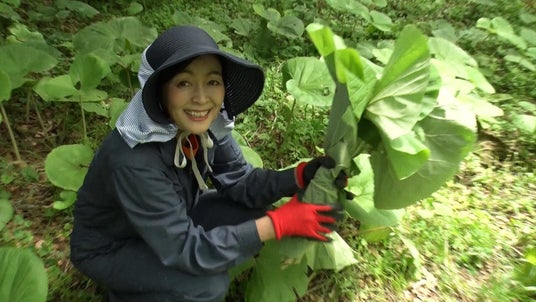 番組後半では、いつもの畑を離れて神秘的な森へ。まるでトトロが住んでいそうな幻想的な空間で、秋田フキを一つ一つ丁寧に収穫していきます。
