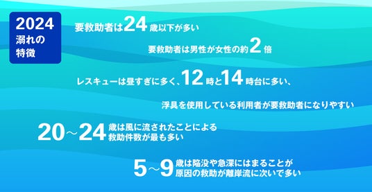 日本ライフセービング協会(JLA)が発行する資格を持つライフセーバーは、全国215カ所で、水辺の事故防止活動を行いました。活動場所でのパトロールログを集計してまとめたところ、要救助者に特徴がありました。