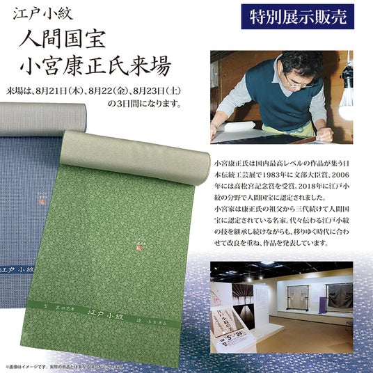- 特別展示販売江戸小紋人間国宝 小宮康正氏来場:8月21日(木)~8月23日(土)