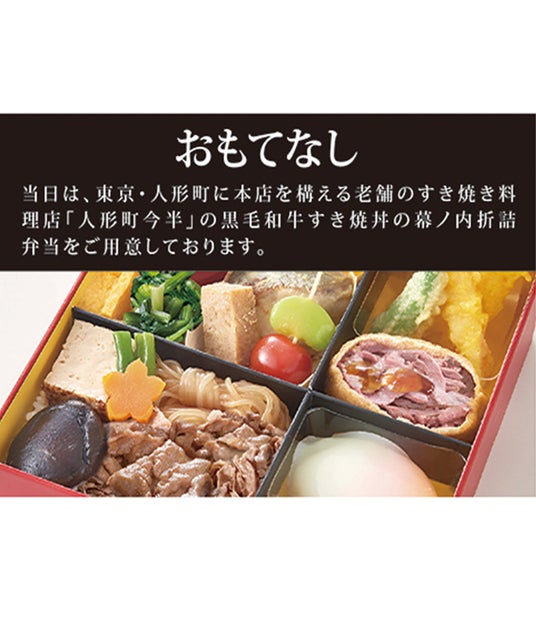 - おもてなし:人形町今半の黒毛和牛すき焼き幕ノ内折詰弁当