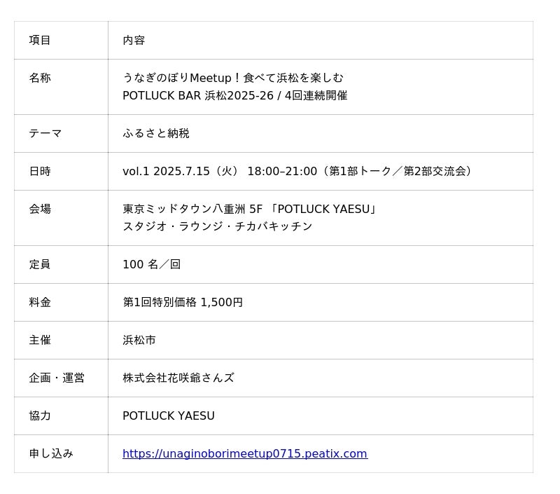 浜松市観光・シティプロモーション課は、東京・八重洲で、"おいしい浜松"を味わう4 回連続企画 『食べて浜松を楽しむ うなぎのぼりMeetup!POTLUCK BAR 浜松2025-26』を開催します。