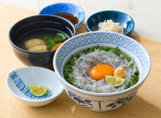 瀬戸内の海の宝石"朝獲れ生しらす"を贅沢に使用。卵黄やすだちで味変も楽しめます。