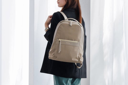 「ロッティ リュックサック」は、軽量なナイロンとお手入れが簡単な合皮素材を組み合わせた本体に、ゴールドパーツをあしらったきれいめ通勤リュックです。ハンドバッグのようなきちんと感と、リュックならではの軽やかさを兼ね備えた上品なデザインで、引手のチャームがさりげない華やかさをプラスしています。
