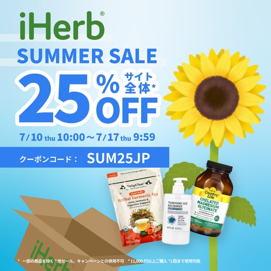このたびiHerbでは、2025年7月10日(木)10:00~7月17日(木)09:59(日本時間)まで、夏の暮らしを心地よくサポートする「iHerb SUMMER SALE 2025」を開催いたします。期間中は、サイト全体が25%OFFとなる特別な1週間です。