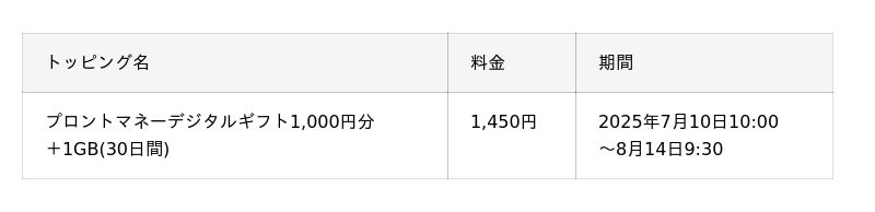 KDDI、沖縄セルラーは2025年7月10日から、povo2.0の期間限定トッピングとして、「プロントマネーデジタルギフト(1,000円分)」と「1GB(30日間)」がセットになったトッピングを1,450円で提供します。
