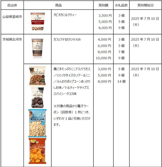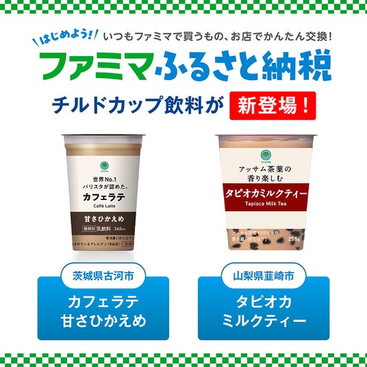 昨今の物価高などの影響で家計への負担が大きくなっている中、このたび、ファミマル「チルドカップ飲料」から、夏にもぴったりな「カフェラテ甘さひかえめ(茨城県古河市)」、「タピオカミルクティー(山梨県韮崎市)」に加え、ファミマルお菓子4商品を追加いたします。お礼品全体では、14自治体36商品に拡大し、日常使いの商品がさらにご利用いただきやすくなりました。