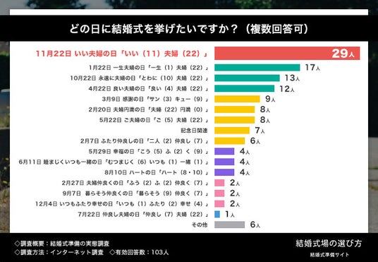 次に「どの日に結婚式を挙げたいですか?(複数回答可)」と質問したところ、やはりというべきか、『11月22日 いい夫婦の日』(29人)が頭一つ抜けた人気を集めました。次いで、『1月22日 一生夫婦の日』(17人)、『10月22日 永遠に夫婦の日』(13人)と、「夫婦」にちなんだ語呂合わせの日が上位を独占する結果となっています。